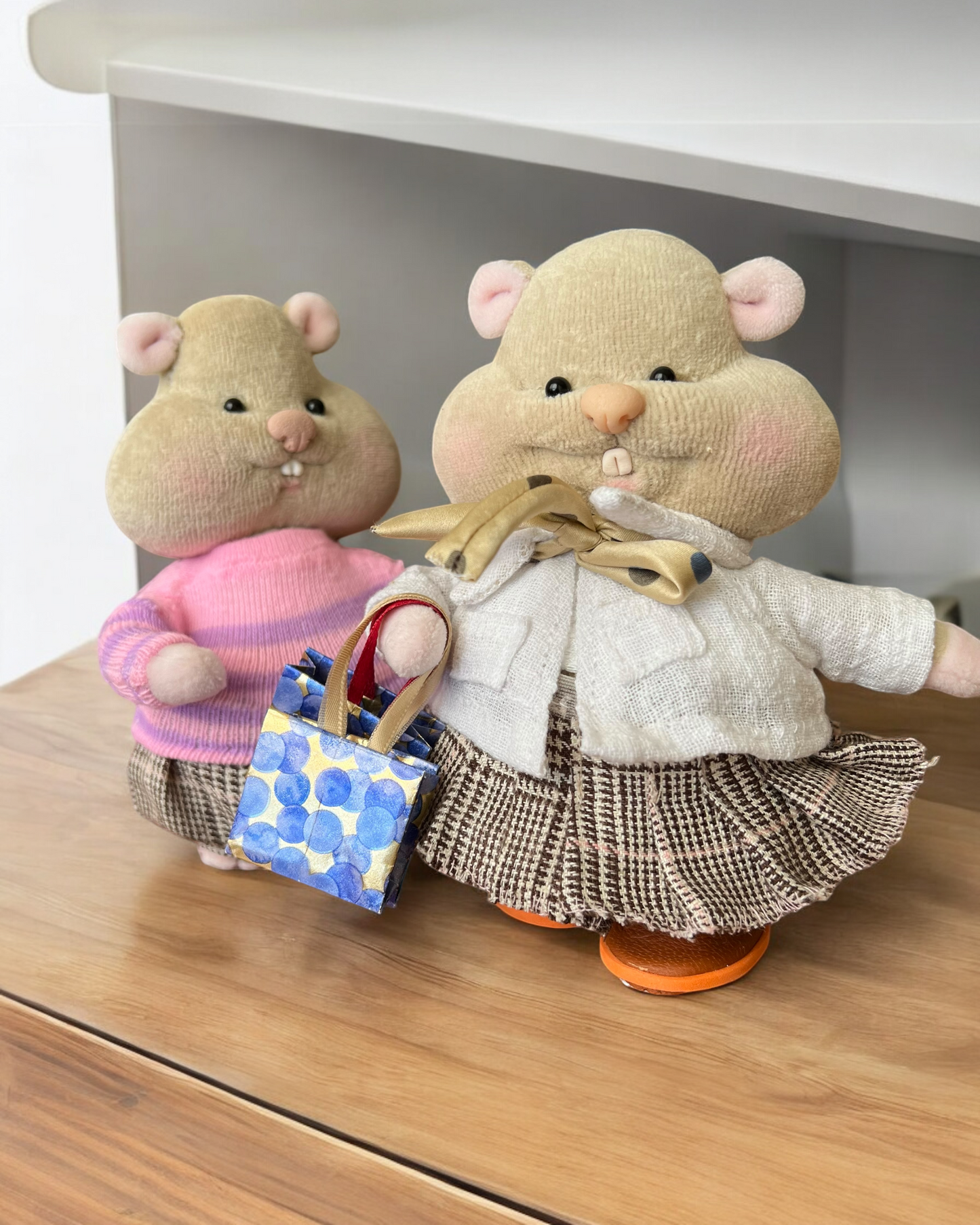 Introducing Henriette, the plush hamster with a flair for fashion and a heart full of love! Dressed in an elegant white cardigan and a chic checkered skirt, Henriette is here to charm and delight.