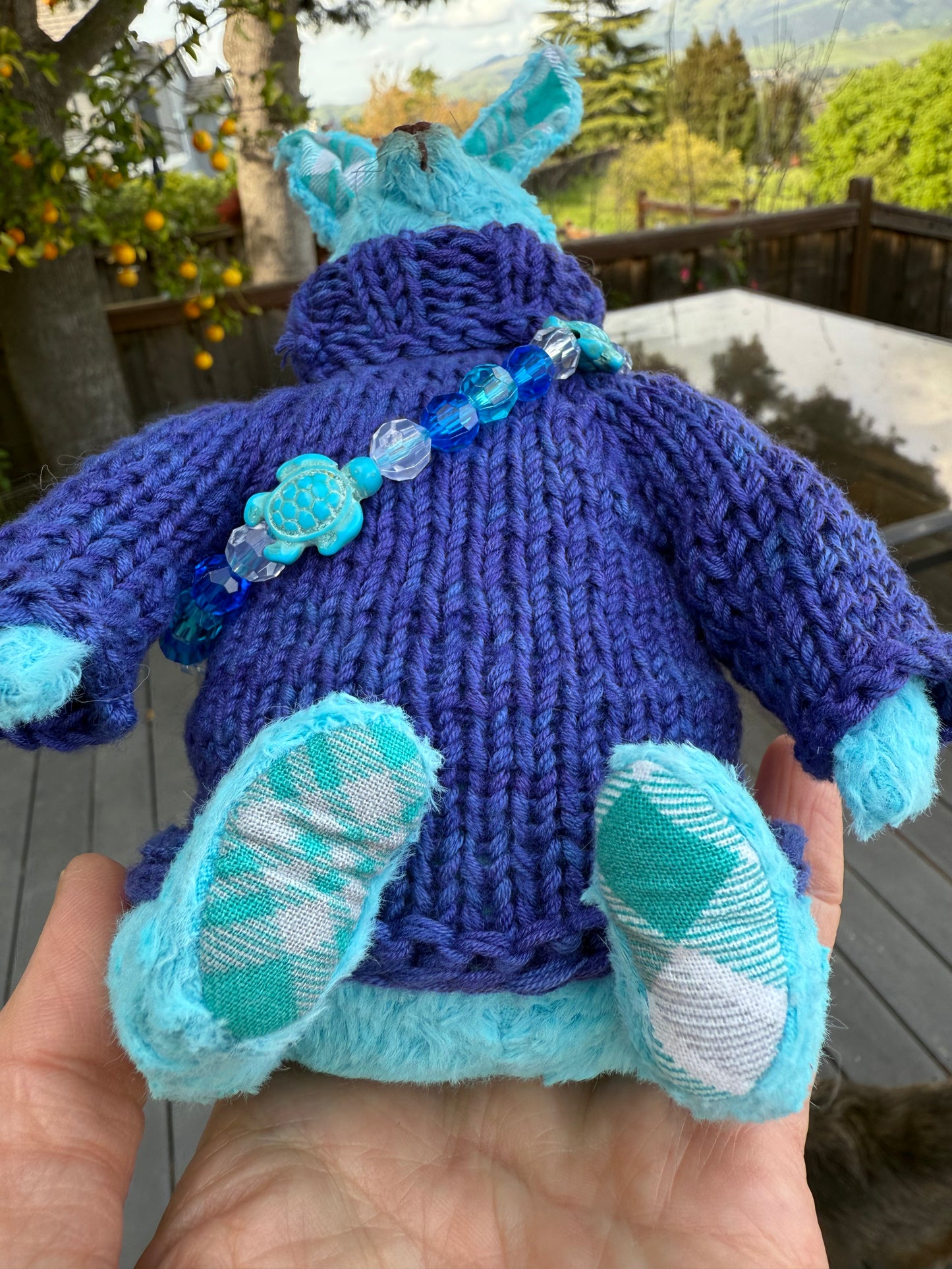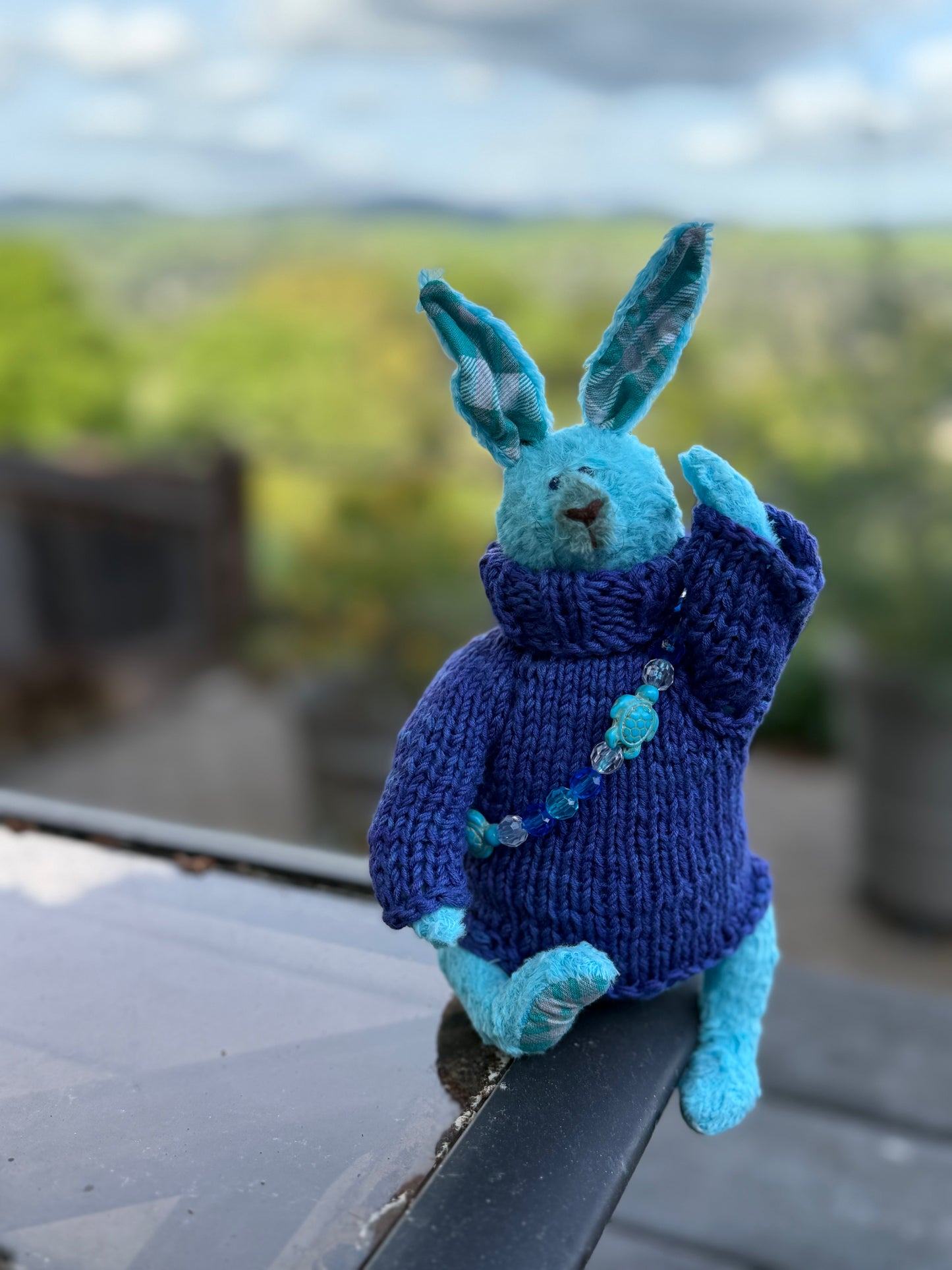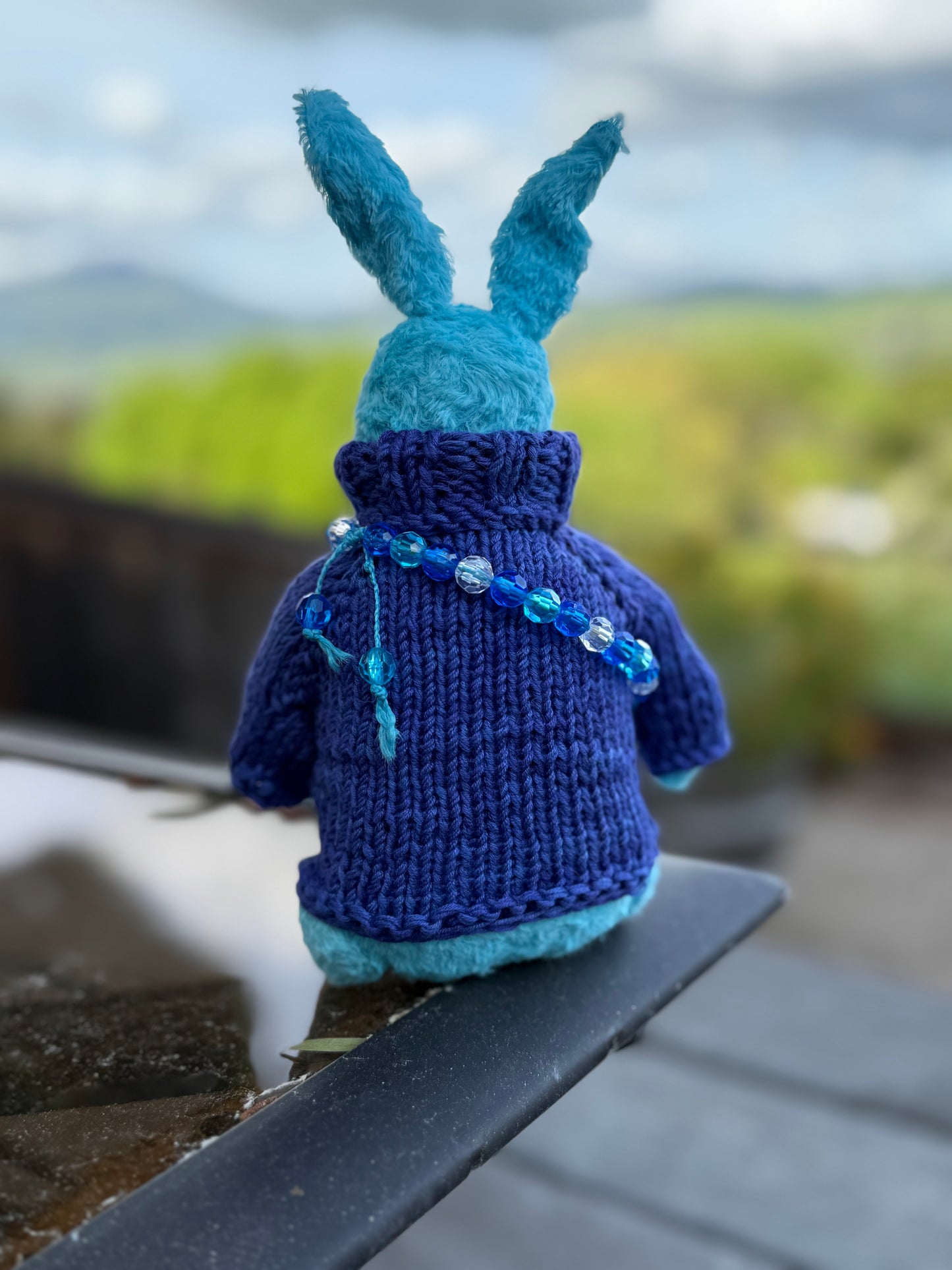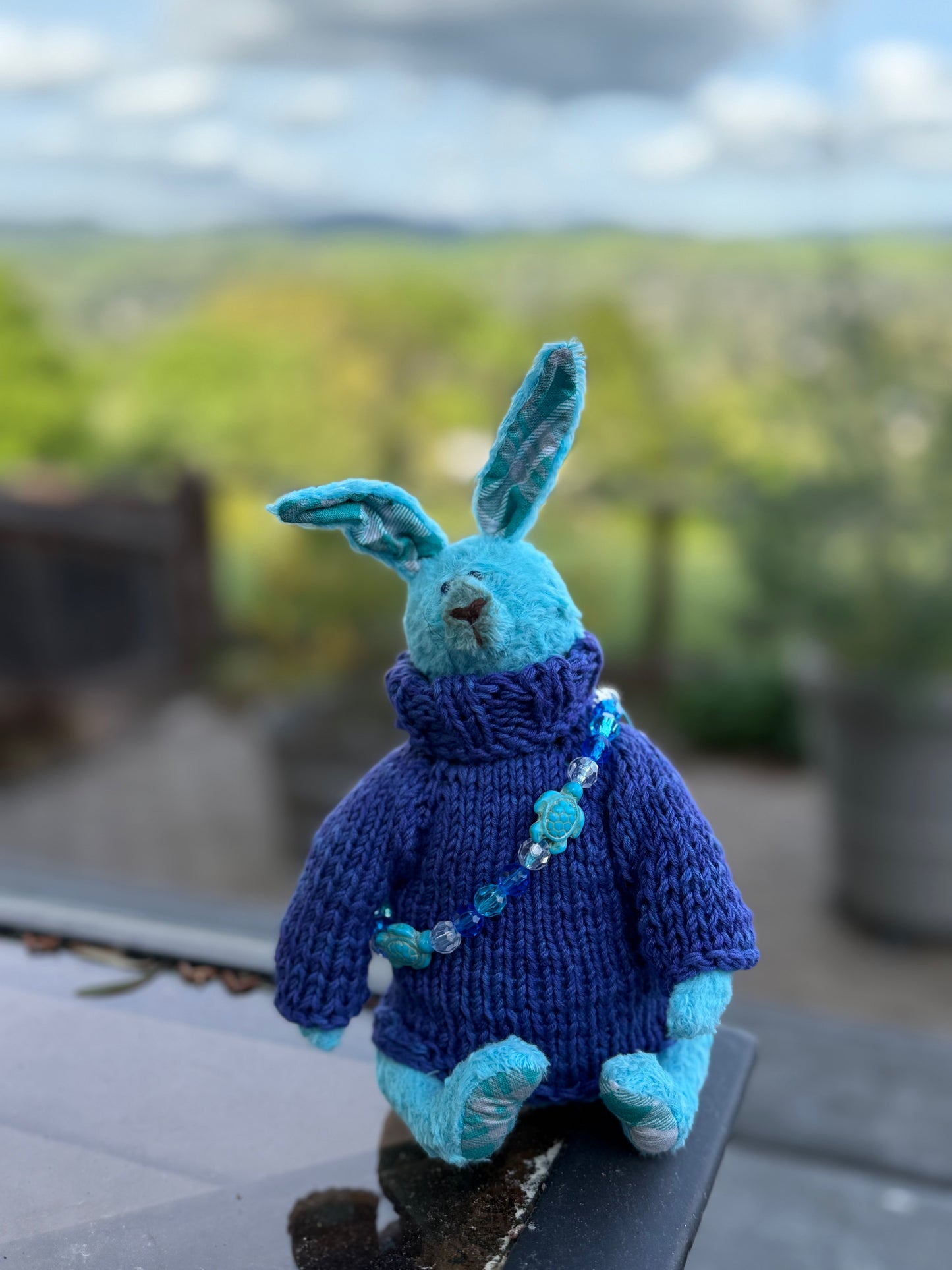 Crafted from soft, high-quality fabric, this plush bunny features a deep blue hand-knitted sweater and a decorative bead necklace. Filled with traditional materials like sawdust and wood wool, it offers a tactile and nostalgic feel. Please note, this bunny is not suitable as a play toy for young children and cannot be washed.